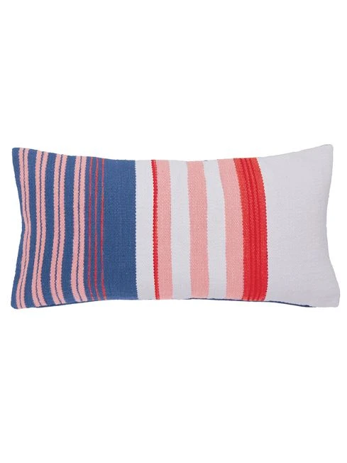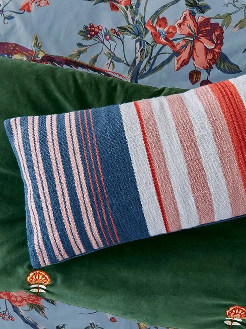 Introduce autumnal hues into your home with this stiped filled cushion. It’s been lovingly hand-woven and features a palette of burnt orange, pink, red, navy and crème. The front has a textured finish, while the reverse is a complementary shade of blue. Add it to the Chinoise Floral bedding set for a complete look, or team it with other furniture in the house.
