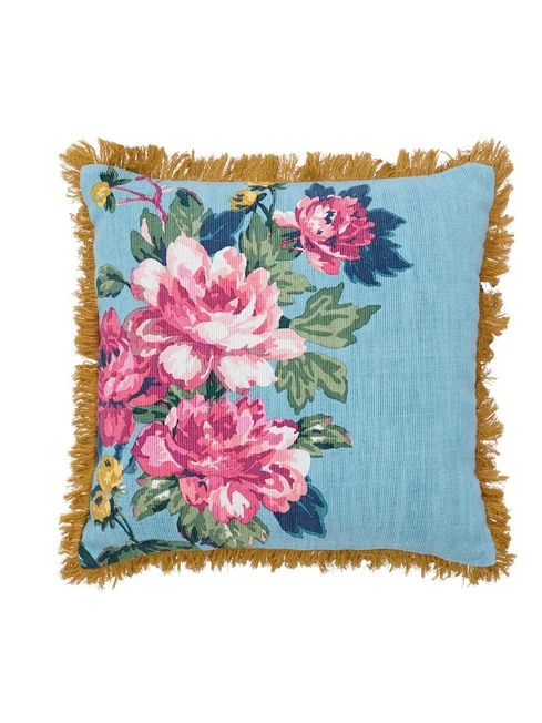 Add a touch of elegance and classic country to your home with this filled cushion. Screen printed onto heavy cotton is a bunch of hand-drawn hydrangeas that are complemented by a blue background. Adding yet more opulence is an antique gold fringed trim that runs around all four edges.