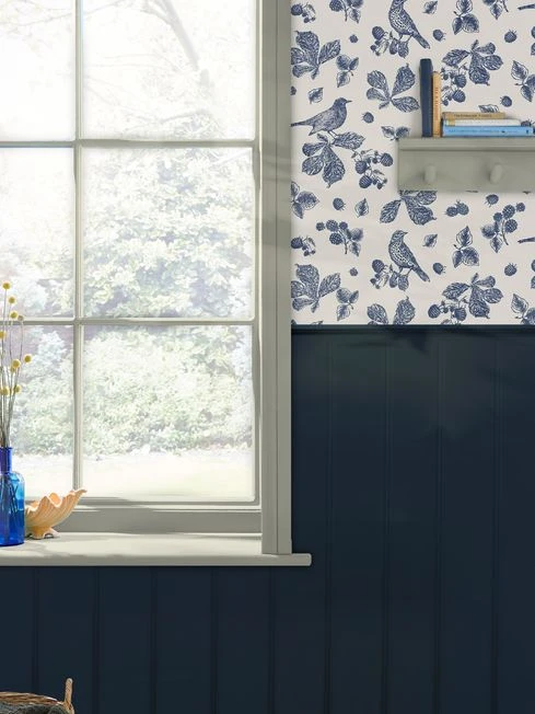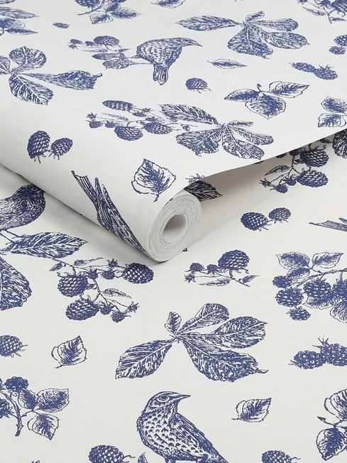 Bring the outside into your home with this delicately drawn wallpaper design. This beautiful pattern showcases multiple birds carefully perched on branches hanging with blackberries in a beautiful navy colour. Printed on a matt substrate for a contemporary look and feel. This wallpaper is also paste-the-wall, making it easy to hang.