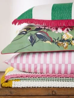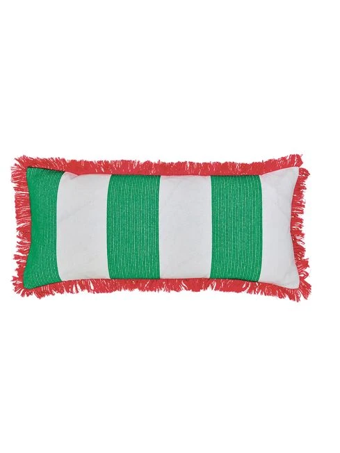 Accessorise your home in style for the season ahead with this statement striped cushion. Bold grass green and fresh créme stripes stand out on the woven fabric, while a bright pink fringed trim adds just the right amount of eccentricity to finish it off. 100% BCI Cotton