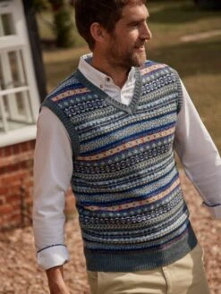 Here’s proof that you can’t beat a classic. Our heritage-inspired Fair Isle knitted vest is best worn over a crisp Oxford shirt for a layer of warmth when the occasion calls for it. Crafted from a soft yet hardwearing cotton blend, it has a traditional ribbed-V-neck as well as a ribbed hem and armholes. As an extra premium detail and unmistakable mark of quality, we’ve added a faux-leather Joules branded patch above the hem. Cotton blend Fair isle pattern V neck Ribbed neck, hem and armholes Faux leather branded tab