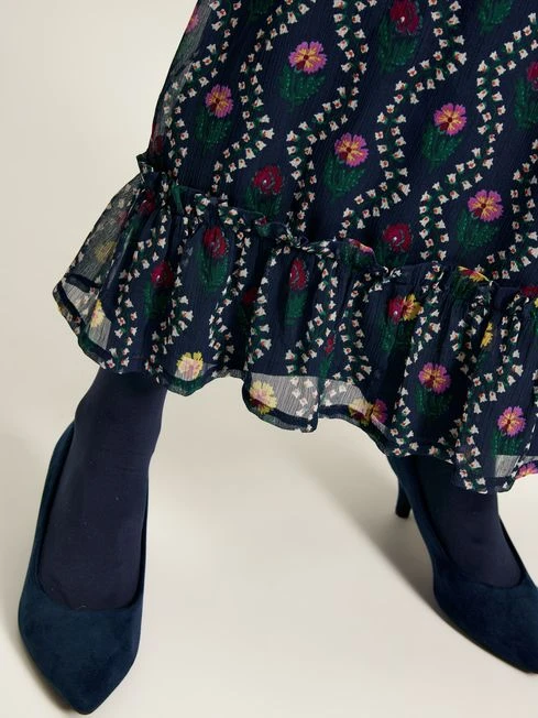 The Helena dress will carry you effortlessly through the autumn and winter months. This transitional number is crafted from light and drapey viscose georgette, has a full lining to the body and sheer blouson sleeves with smocked cuffs. It falls to a maxi length with a peplum hem. Details galore, such as a pleated bodice, frilled neckline with keyhole button fastening, a frilled trim to the hem and a new season floral print, tranform it into a true conversation starter. Pockets to the side seams and an invisible zip to the centre back completes it to perfection. Viscose Georgette Maxi length Full viscose lining Peplum hem with frill detailing Long sheer sleeves with smocked cuffs Pleated detail to the bodice Round neck with frilled trim and keyhole button fastening Pockets in the side seams Invisible zip to the centre back Length: 138cm (based on UK size 12)