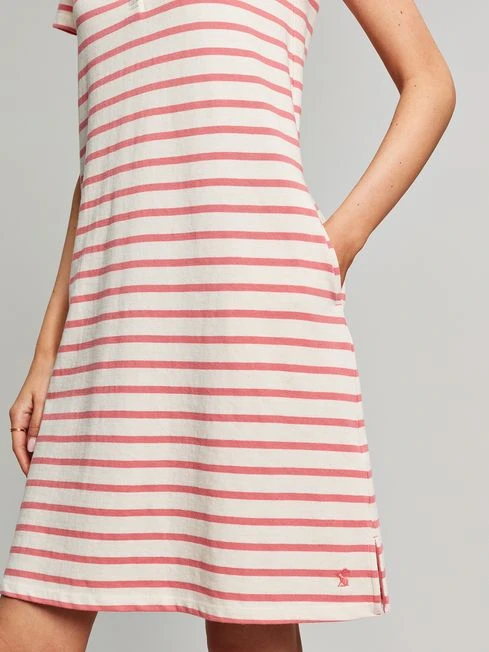 This Henley-style jersey dress will make for easy summer styling. It sits above the knee, and has a flattering a-line shape, a button placket and short set-in sleeves. The pockets in the side seams add to its laid-back feel and the coastal stripes keep it timelessly stylish.