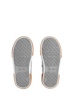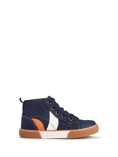 F = Standard Fit. Start-Rite’s contemporary hi-top for the cool kids in the playground. A grownup lace-up design with a handy side zip, these canvas kicks can be slipped on and off fast. Great for both indoors and outdoors, there is added toe protection and an engineered tread for grip on most surfaces. They are also washable at 30 degrees so keeping them clean and fresh is easy. In breathable navy canvas with white and orange accents. Don’t forget to add a Start-Rite measuring gauge to your basket – fit at home the Rite way using the video to help you.