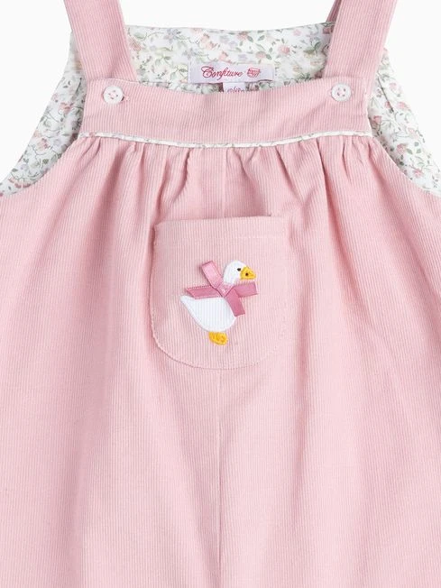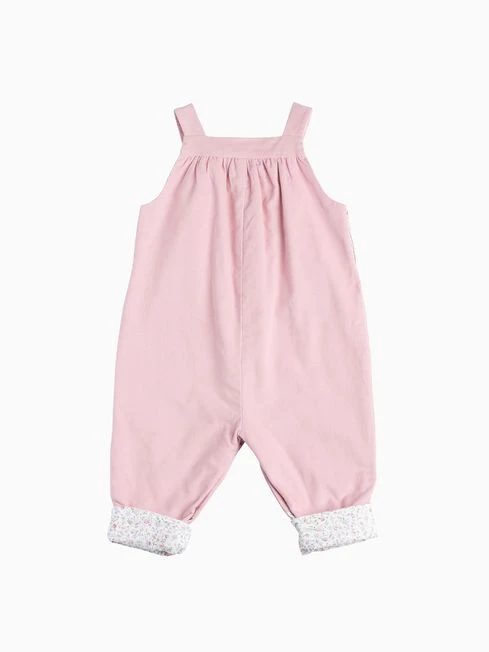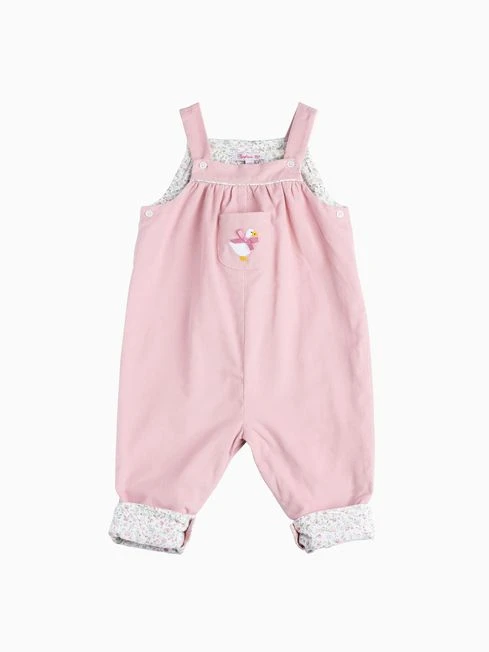 A childhood staple, these full-length dungarees make a quick and easy outfit for baby girls. Made in a fine pink needlecord, they come complete with sweet turn-ups, a little front patch pocket and appliqué duckling detail with pink satin bow. Feature pearlised button fastenings and concealed poppers, they re lined in pretty miniature floral print fabric, a pretty floral design with a fine, crisp outline dating back to the early 1930s.