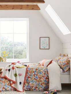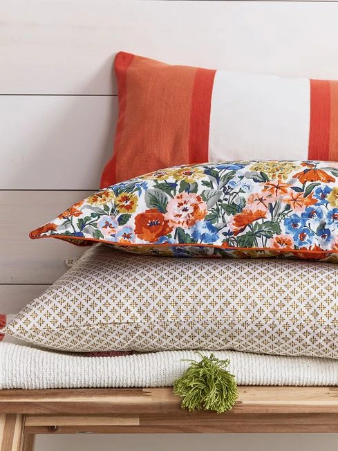 Emblazoned with stripes in a burnt orange and red colour palette, this filled cushion is made for the autumn months. A crewel embroidery technique has been adopted to create the cushion and it’s been made using 100% cotton. The reverse of the cushion is a fiery red to match the stripe design. Layer it on top of the Bunbury Floral set to create the ultimate look for your bedroom.