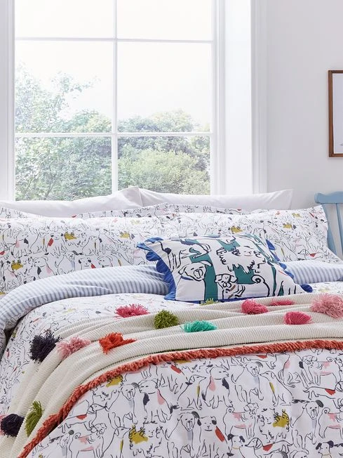 Add a playful touch to your home with this filled cushion. It features an array of line-drawn dogs printed against a green and white striped background. It’s crafted from 100% cotton slub and finished with an exaggerated blue scalloped trim.
