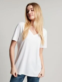 Our new Emily Jersey T-shirt will fit into your everyday wardrobe seamlessly. Its short sleeves and flattering V-neck make it easy to layer up when needed. The dropped, curved hem keeps it looking great whether worn untucked or tucked in. It’s finished with a tonal Joules embroidered hare to the hem.